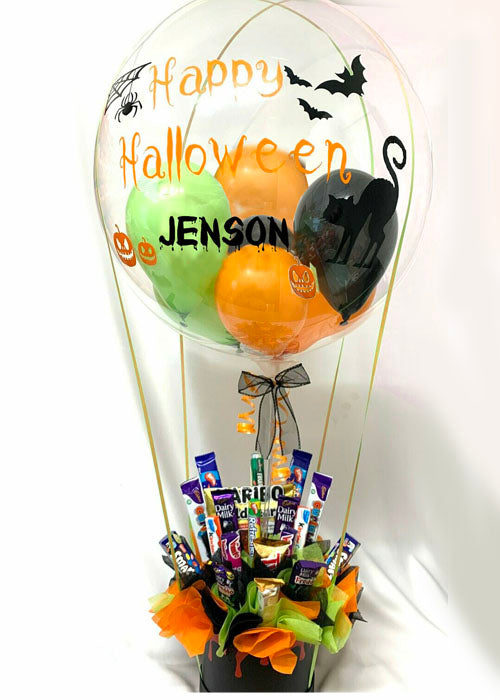 Celebrate Halloween with a smile thanks to this unique gift - a Halloween Air Balloon with a personalised Deco Bubble filled with mini balloons and delicious chocolates and sweets! Perfect for any candy-loving recipient.