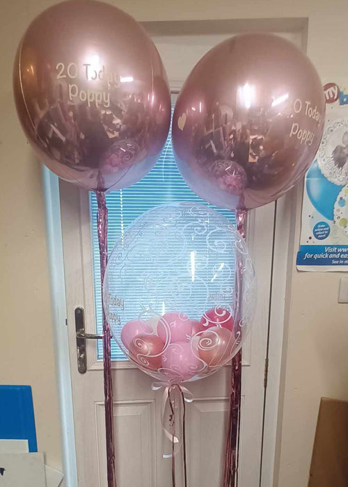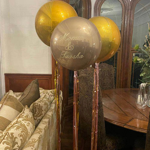 Choose from a vast arrange of colours and design printed orbz. They are inflated with helium and come with a foil tail ribbon & weight. They can be floor or table balloons